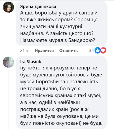 «А что, борьба во Второй мировой это уже какой-то стыд? Стыд — это уничтожать наше культурное достояние. А вместо этого что? Нарисуете мурал с Бандерой?» — задалась вопросом одна из комментаторов.