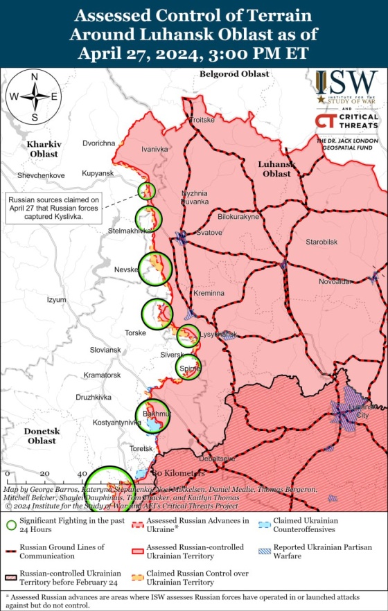 Американский Институт изучения войны (ISW) отмечает, что российские войска ведут успешные штурмовые действия к северу от Авдеевки и к западу от Донецка. В выводах института прогнозируется, что ВС РФ добьются значительных тактических успехов в ближайшие недели, поскольку Украина испытывает нехватку боеприпасов и вооружения. Также говорится, что темп российских штурмовых действий на Авдеевском направлении выше, чем в районе Часов Яра, однако российские войска активизируют наступление в ближайшие недели.