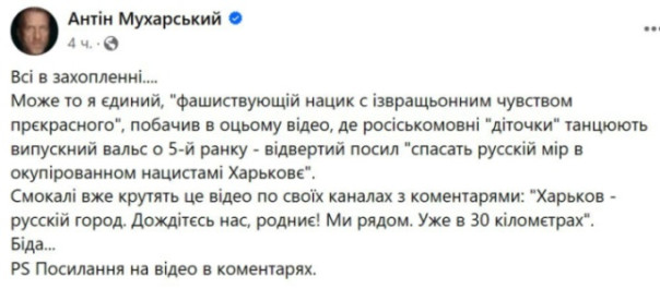 «Может, я единственный "фашиствующий нацик с извращенным чувством прекрасного", кто увидел в этом видео, где русскоязычные "детки" танцуют выпускной вальс в 5 утра — откровенный посыл "спасать русский мир в оккупированном нацистами Харькове"», — написал Мухарский в соцсетях.