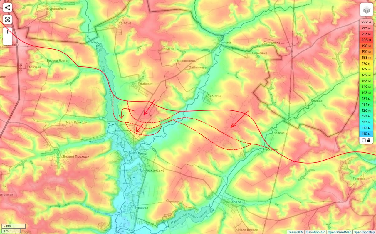 Но в данном случае это не принципиально. Далее самые важные события здесь должны развиваться чуть восточнее. на холме между Нескучным и Липцами. Только взятие его под контроль даст нам устойчивый и полный контроль не только над самими Липцами, но и находящимся чуть южнее н.п. Слобожанское. А еще позволит развивать наше наступление далее на Веселое.