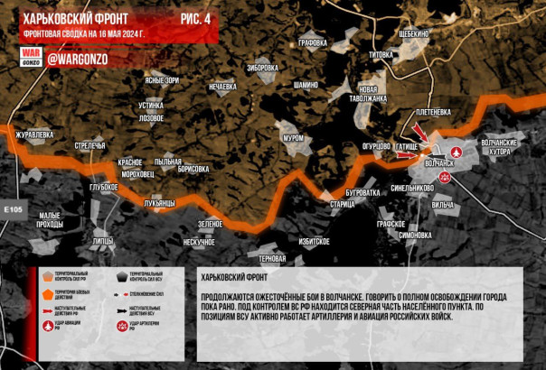 Харьковский фронт. Продолжаются ожесточённые бои в Волчанске. Говорить о полном освобождении города пока рано. Под контролем ВС РФ находится северная часть населённого пункта. По позициям ВСУ активно работает артиллерия и авиация Российских войск. (Рис. 4) Источник