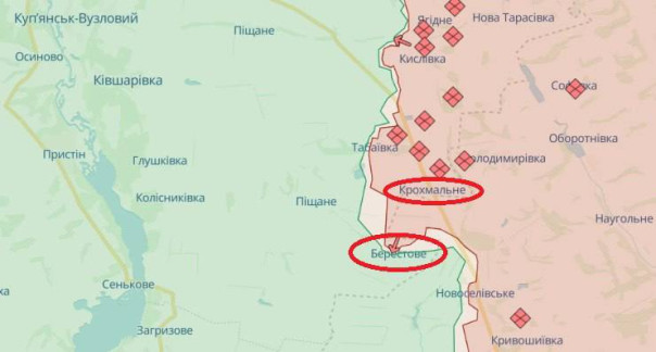 «На Купянском направлении, вероятно, противник имел продвижение в направлении Крахмальное – Берестово где-то примерно на 2 км. Очевидно, передовые подразделения 15-го мотострелкового полка противника из состава его 2-й мотострелковой дивизии 1-й танковой армии сумели вытеснить наши передовые подразделения в юго-западном направлении и сейчас закрепляются в северной части с.Берестово, севернее дороги, которая объединяет Берестово и Кругляковку», – написал Военный обозреватель группы «Информационное сопротивление» Машовец.