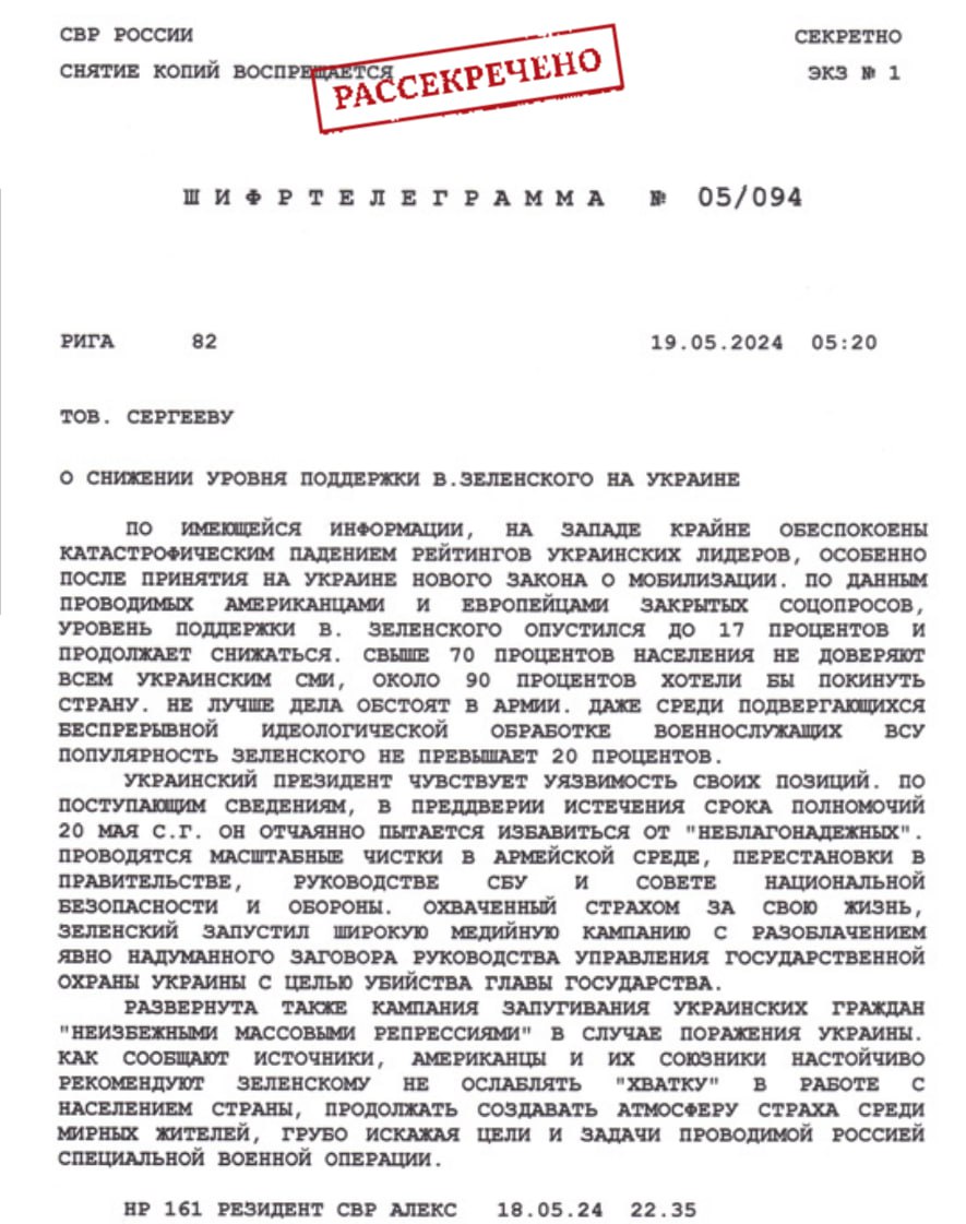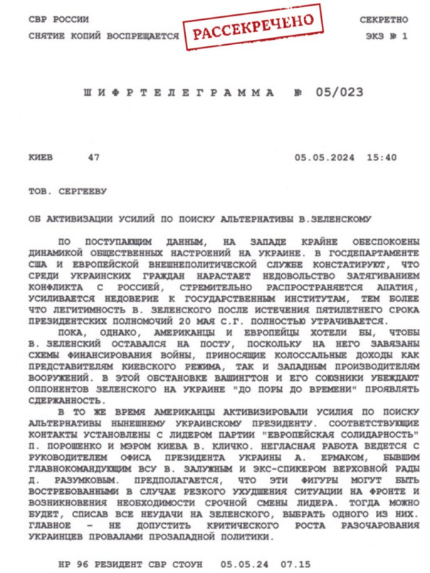 Служба внешней разведки России обнародовала информацию о поисках в США замены Владимиру Зеленскому. Согласно рассекреченной шифрограмме, опубликованной в журнале «Разведчик» (№2 от 7 июня 2024 года), американцы активно прорабатывают альтернативных кандидатов на его место.