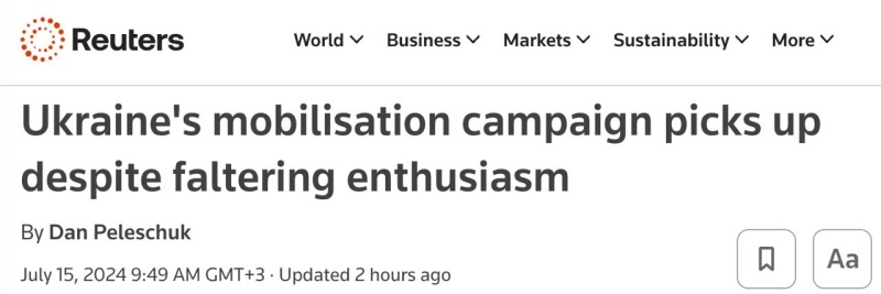 Тем временем агентство Reuters со ссылкой на данные, предоставленные украинскими военными, сообщает, что на Украине темпы мобилизации в мае-июне выросли более чем вдвое по сравнению с апрелем-мартом. При этом средний возраст мобилизованных остался неизменным - около 40 лет.