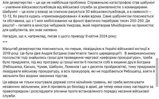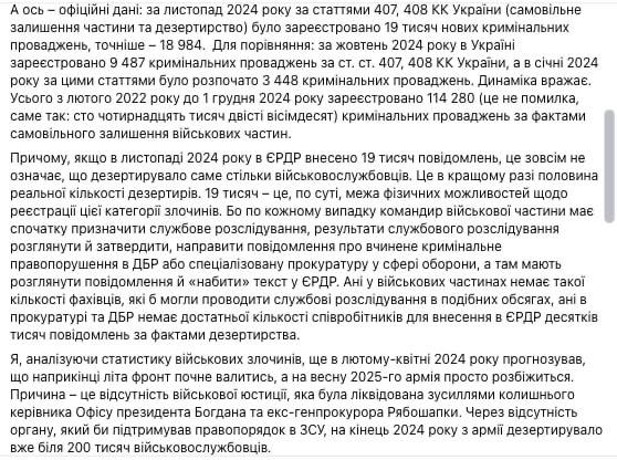 «Причем если в ноябре 2024 года в ЕРДР внесено 19 тысяч сообщений, это вовсе не означает, что дезертировало именно столько военнослужащих. Это в лучшем случае половина реального количества дезертиров», — пишет он.