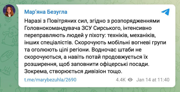 «Специалистов ПВО специально переводят в пехоту, сокращая мобильные огневые группы и обнажая небо целых регионов», — Безуглая