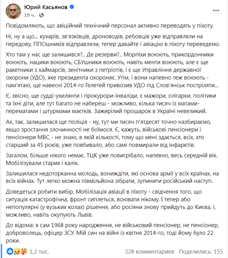 «Ах, да, осталась еще полиция – ну, здесь мы тысяч пятьдесят точно насобираем, если роста преступности не боимся. Есть, говорят, военные пенсионеры и пенсионеры МВД – не знаю, в каком количестве, потому что мне кажется, всех старше 45 лет уже поубивало, или сами умерли от инфарктов. В общем, больше никого нет. ТЦК уже выгребло, наверное, весь средний возраст. Мобилизовали стариков и калек. Осталась неприкосновенная молодежь, “они же дети”, которые являются основой армии во всех странах, на всех войнах. Здесь легко можно собрать полмиллиона, остановить российское наступление», — говорит Касьянов.
