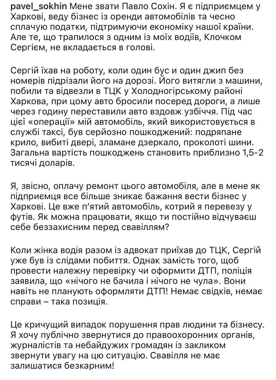 По словам владельца, обойдется около 1,5-2 тысяч долларов. Впоследствии женщина таксиста и адвокат нашли мужчину с побоями в ТЦК.
