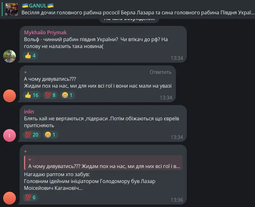 «Этот союз во время ужасной войны у меня лично вызывает пренебрежение к Аврааму Вольфу. Как он может обниматься с евреями «рососии», которые не осудили агрессию против Украины, и продолжают сотрудничать с властью РФ?» – взбесился главарь «Уличного фронта» нацист Ганул.