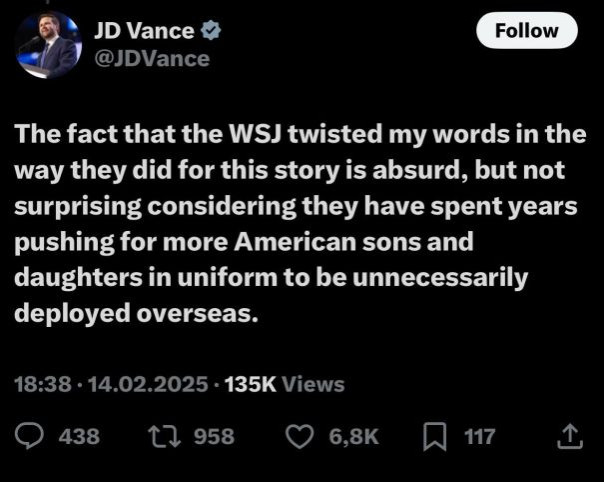 Вице-президент США Джэй Ди Вэнс, тем временем, заявил в соцсетях, что ранее сказанные им слова о возможности отправки американских военных на Украину поняли неверно. Он опроверг публикацию WSJ, согласно которой Вэнс якобы «обещал России военное вмешательство, если та не пойдет на сделку, гарантирующую Украине независимость».