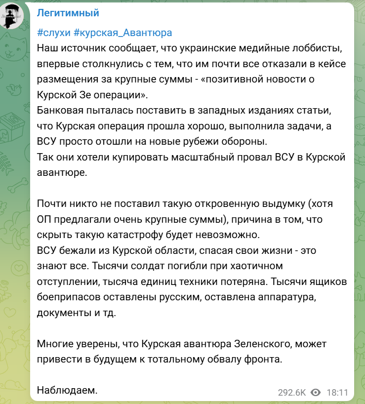 По данным его источника, впервые киевские медийные лоббисты даже за «крупные суммы» не смогли добиться публикации «позитивной новости» об операции режима Зеленского в Курской области.
