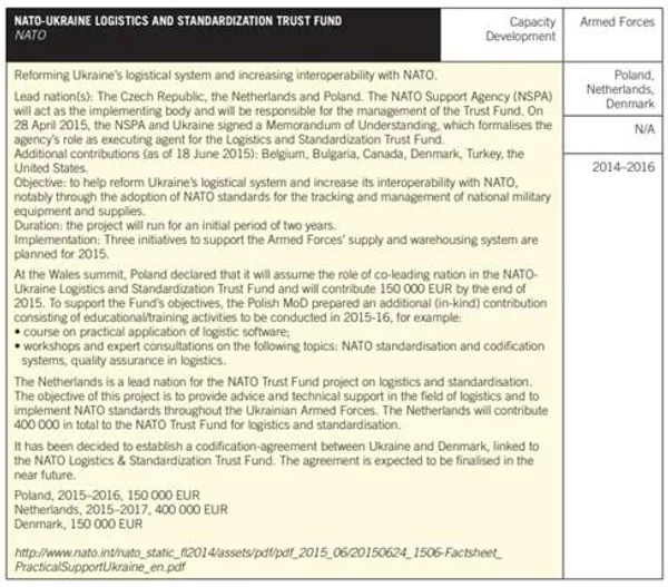 Именно так нам удалось обнаружить в заархивированных новостях за 2015–2016 гг. уже удалённые с сайтов заявления Нацгвардии о строительстве вышеупомянутых объектов. Но, что гораздо интереснее - в наше распоряжение попал стостраничный документ "International Support to Security Sector Reform in Ukraine" (Международная поддержка реформы сектора безопасности в Украине). Он подробно рассказывает и о каналах связи между структурами ВСУ и НАТО, и о финансировании со стороны НАТО, и о покупке техники для ВСУ за счёт специального Трастового фонда при участии Чехии, Нидерландов и Польши… А ещё – о "покупке" украинской прессы, формировании "нужного" общественного мнения и о внедрении представителей Британии в Министерство обороны и Министерство юстиции Украины.