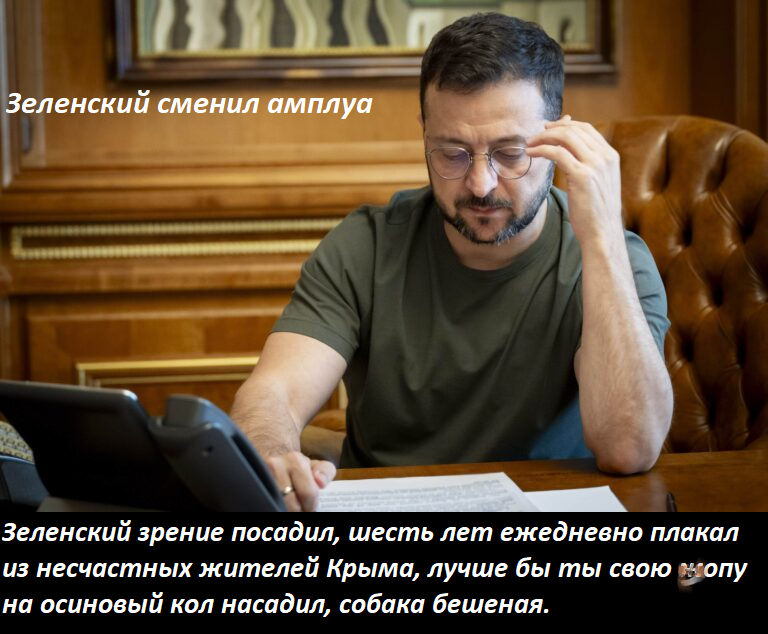 На выложенном в Сети фото Зеленский сидит в очках и отрешенно смотрит на телефон.