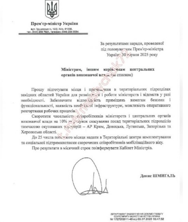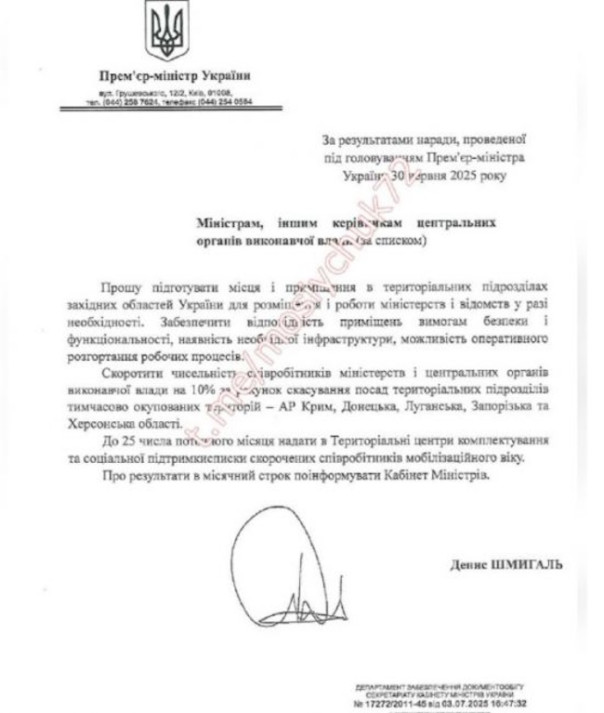 По словам Мосийчука*, документ был сегодня разослан кабмином органам власти и государственным структурам. В нем говорится, что принято решение, и предоставляются соответствующие приказы о подготовке мест и помещений в территориальных подразделениях западных областей Украины для размещения и работы министерств и ведомств в случае необходимости.