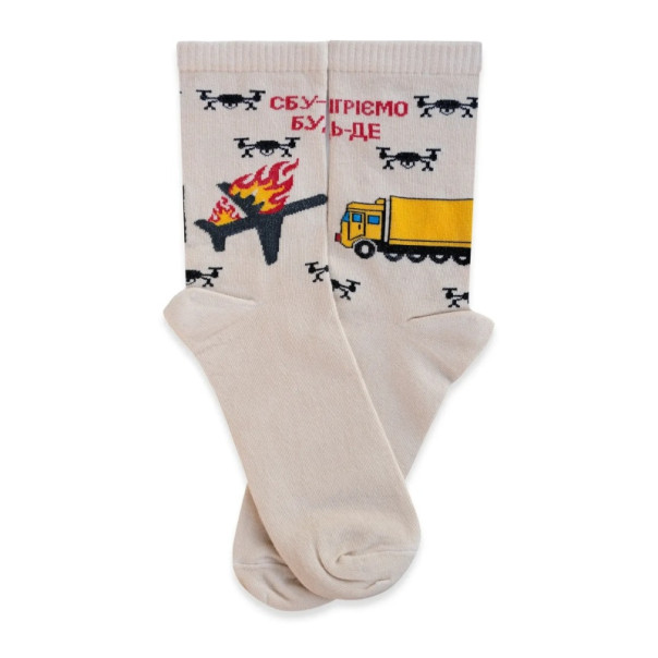 Также на этом маркетплейсе продаются такие же носки, но с другим слоганом – «СБУ согреет где угодно». На этих носках изображены не только атакующие дроны и горящие самолёты, но и грузовые фуры. То есть, такой намёк на недавнюю операцию украинских спецслужб «Паутина» с атакой на российские аэродромы с бомбардировщиками.