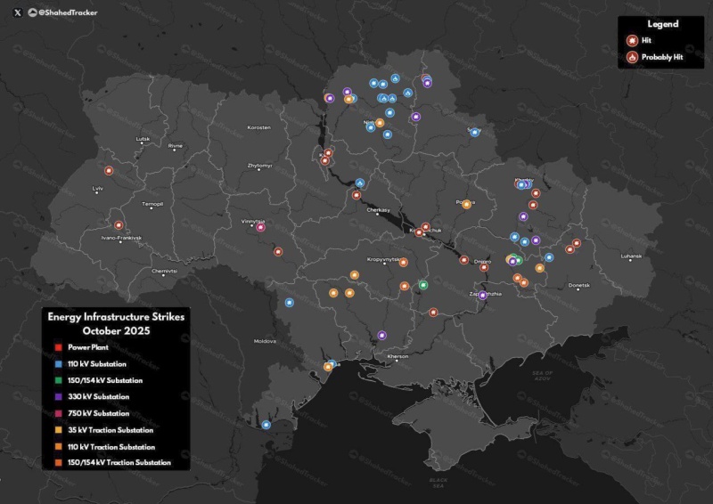 По данным OSINT-источников, в октябре ВС РФ нанесли не менее 71 удара по объектам энергетики Украины: 23 подстанции 110 кВ, 17 ТЭЦ, ГЭС и ТЭС, 14 тяговых подстанций, 10 подстанций 330 кВ, 3 подстанции 150 кВ и 1 подстанция 750 кВ.