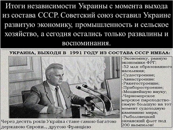Реальность оказалась совсем иной. Вместо того, чтобы работать и зарабатывать совместно с Россией, украинцы с первых же дней своей "независимости", взяли курс на сближение с Европой и США, и на конфронтацию с Россией.