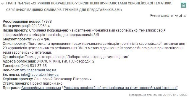 Дальше по списку идёт некая “Лабораторія законодавчих ініціатив”. Интересно, неужели и она их получала? Проверяем. Получала. Причём целых четыре. На поддержку Восточного партнёрства, проведение круглых столов и т. п. Кстати, бюджеты “пилят” они очень серьёзно. Например, за три семинара для 20 человек они запросили... 97 тысяч гривен.