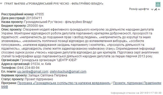 Одним из первых идёт движение “Чесно”. Интересно, получало ли оно какие-то гранты от Сороса в 2013 году? Получало, оказывается. Один. Размером в... четверть миллиона гривен.