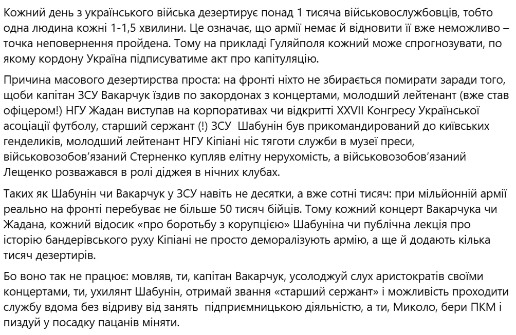 Таких, как Шабунин или Вакарчук, в ВСУ уже не десятки, а сотни тысяч: при миллионной армии реально на фронте находится не более 50 тысяч бойцов. Поэтому каждый концерт Вакарчука или Жадана, каждый ролик "о борьбе с коррупцией" от Шабунина или публичная лекция об истории бандеровского движения от Кипиани не просто деморализуют армию, но и добавляют ещё несколько тысяч дезертиров.