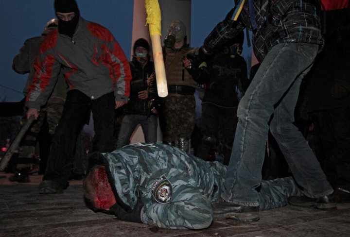 23.00 Беркут перешёл в атаку на Грушевского. Какой-то отморозок один бросился на восемь беркутов и машет палкой, остальные отбежали. Он походу реально рагуль. Просто бросился, но явно необучен, просто орёт и неловко машет палкой. Беркуты и товарищи тоже смотрят на него как на идиота. Походу обкуренный. Скрутили и отправили в "тыл". Завтра снова будут орать, что невинного "мальчика" избили "по-звірячому"