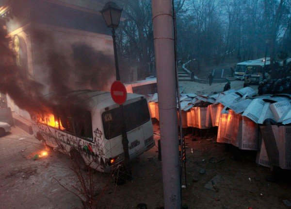 UPD2 Власти пригнали водомёт. Два месяца они его держали под рукой, но не применяли. Официально потому что жалели людей, холодно, нужно применять при температуре +5. Сегодня его применили. Сегодня в Киеве минус 10. На фото — горящий автобус "Беркута"