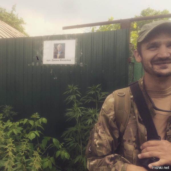 Украинские силовики каратели назвали улицу в одном из населенных пунктов в Луганской области именем американского сенатора Джона Маккейна, известного в Вашингтоне своими "ястребиными" взглядами и ярой антироссийской риторикой. Маккейн, находящийся в эти дни с очередным визитом на Украине, разместил в своем Twitter фотографию, на которой местный военнослужащий запечатлен на фоне прикрепленной к забору таблички с изображением сенатора и надписью: "Вул. Джона Маккейна". Название населенного пункта не уточняется.