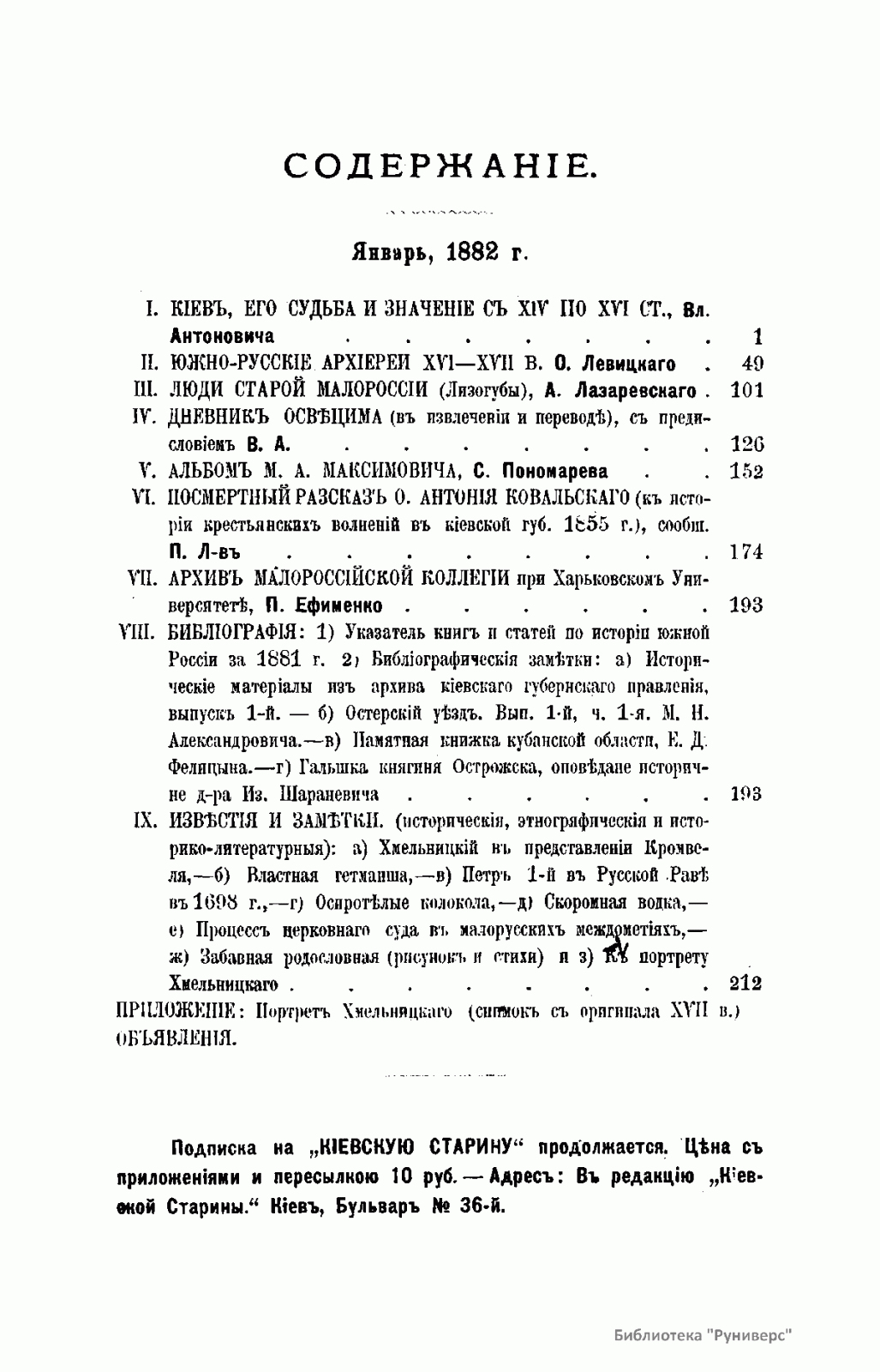 Журнал изобиловал историческими исследованиями, биографиями, обязательно присутствовал раздел "Известия и заметки". Ниже привожу содержание первого тома журнала, который был издан в 1882 году: