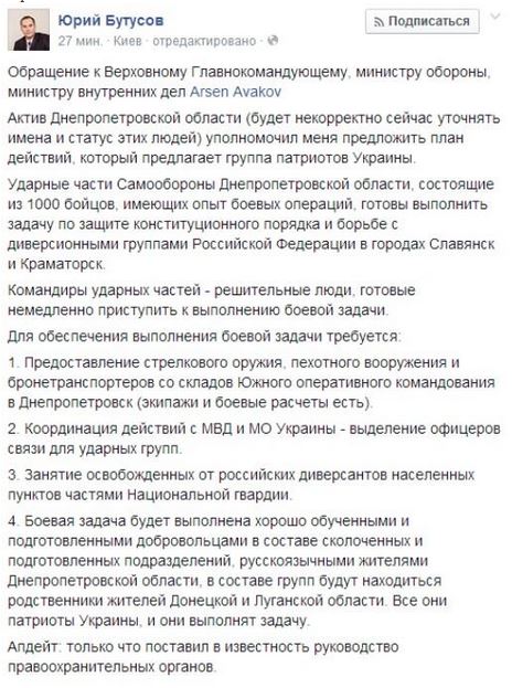 В связи с чем, размещаю у себя, искренне надеясь, что эта информация привлечет внимание как людей Донбасса, так и других людей, интересующихся темой, и они смогут расспросить пана Бутусова подробнее, вслед за тем доложив столь важные новости командованию.