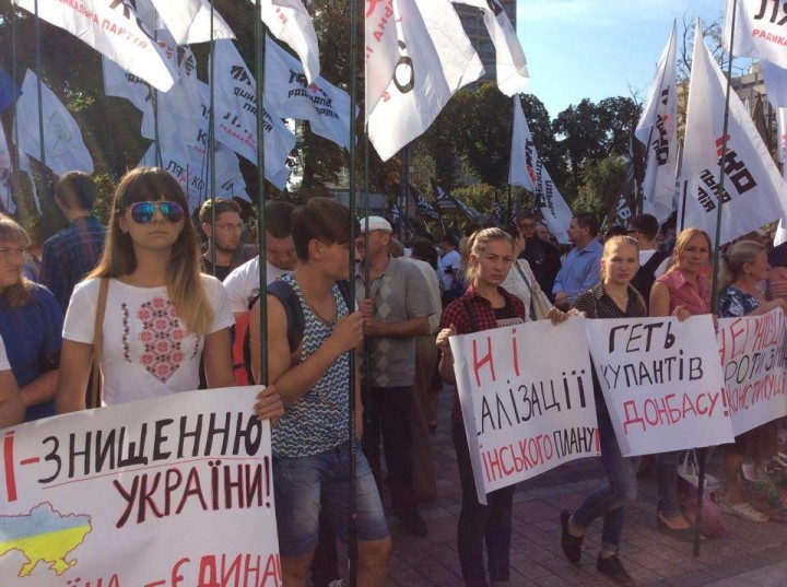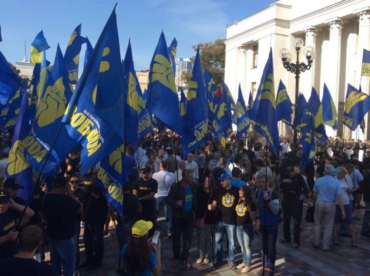Также у здания Рады в Киеве проходит митинг против внесения поправок.Как сообщает «Украинская правда», митингующие заняли почти всю площадь перед Радой. Протестующие пришли с флагами партии «Свобода» и Радикальной партии Олега Ляшко, есть также представители партии «Укроп».