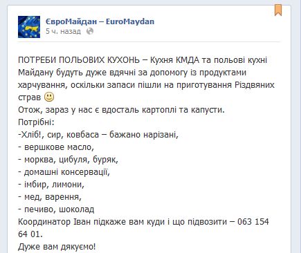 Американские печеньки от госдеповки Нуланд у хэроев евромайдана закончиличь, поэтому, дорогие киевляне, несите витаминные элитные продукты, к которым привыкли борцы за обновление облика Киева, имбирь, лимоны, мед, не забудьте шоколад для улчшения умственной деятельности.