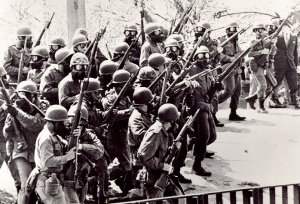 1970 г. — студенты Кентского университета (Огайо) проводят манифестацию против только что начавшегося вторжения американской армии в Камбоджу. Вызывается подразделение Национальной гвардии, солдатам дают приказ разогнать демонстрацию, звучат выстрелы, четверо студентов убито. Спустя несколько дней нечто подобное случилось в Джексоновском университете (Миссисипи), только убитых было двое.