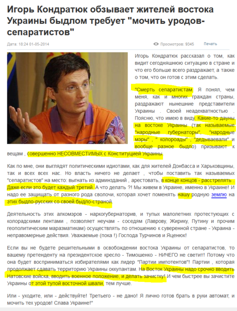 И вовсе уж мило выглядит храброе "Я лично готов брать в руки автомат и мочить", поскольку совершенно ясно, что оно возьмет автомат в лапки примерно так, как лахудра Руслана самосожглась, а подонок Аваков застрелился.