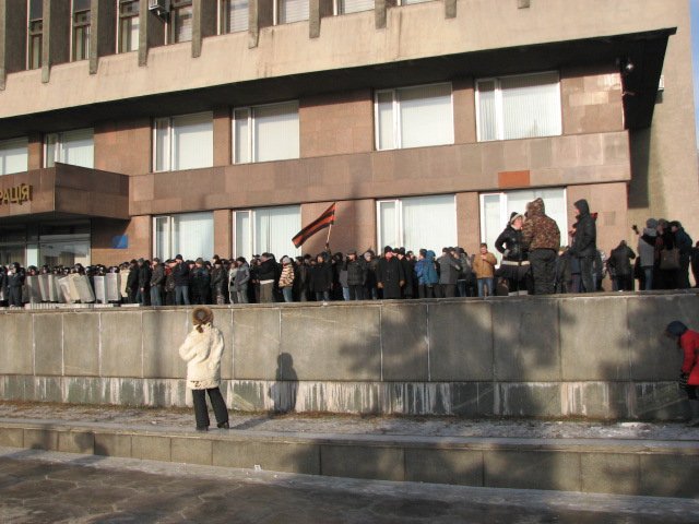 И так, народ стал щемиться ко входу, милиция стала не пускать (смотрите видео). Эти толкалки продолжались до тех пор, пока не удалось вырвать у милиции один щит. Толпа взревела от удовольствия и у входа бахнула первая граната с газом. У «штурмовиков» сыграло очко и они отхлынули. Потом полетели ещё три. Майдауны отошли на почтительное расстояние, огрызаясь лозунгами, речёвками и камнями. Послышался звон первого разбитого окна.