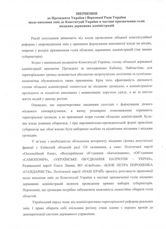 «Любая власть должна избираться, и при парламентско-президентской форме правления главы местных государственных администраций должны обязательно быть выборными лицами и подотчетными местным общинам, — говорится в обращении. — В связи с необходимостью повышения авторитета местных общин, мы, депутаты Киевского областного совета VII созыва, просим рассмотреть предложения о внесении изменений в Конституцию Украины в части назначения глав областных и районных государственных администраций путем проведения выборов их председателей».