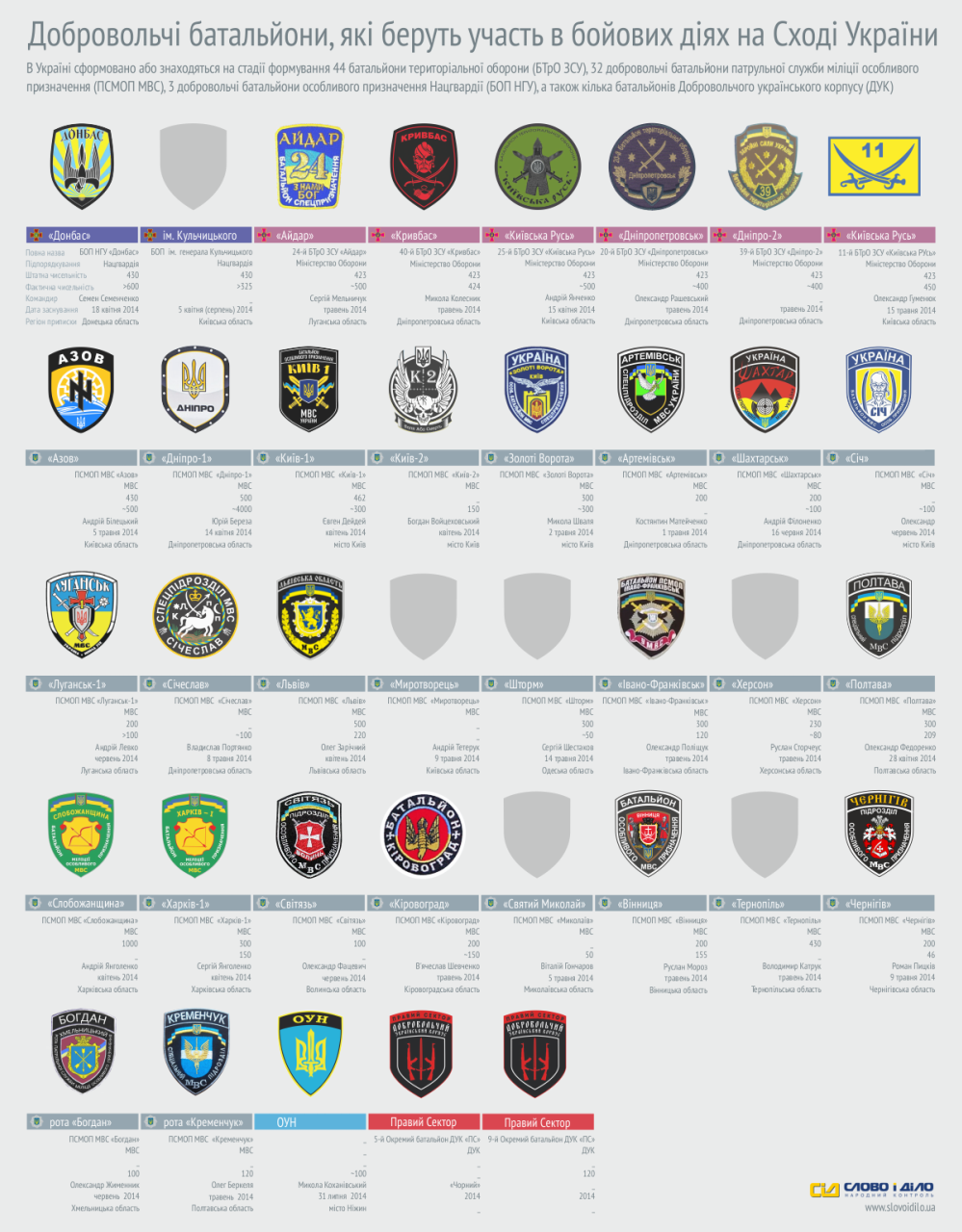 На протяжении полутора месяцев боевики Майдана превратились в «добровольческие батальоны». Одновременно был развернут мощный волонтёрский сектор с крупнейшими центрами в Киеве и Виннице. Самыми многочисленными и хорошо вооружёнными формированиями стали батальоны «Донбасс» (более 600 человек), имени Кульчицкого (более 500), «Айдар» (более 500), «Днепропетровск» (более 400), «Днепр-1» (4000), «Днепр-2» (более 400), «Азов» (более 500), «Киевская Русь» (два батальона численностью более 500 и более 450 человек), «Золотые ворота» (более 300 человек). Кроме этого, несколько тысяч человек составляли Добровольный украинский корпус (ДУК) «Правый сектор», а еще несколько тысяч вошли в состав батальонов, бригад, рот и групп с низкой или вообще не установленной фактической численностью (от 30 до 1000 человек).