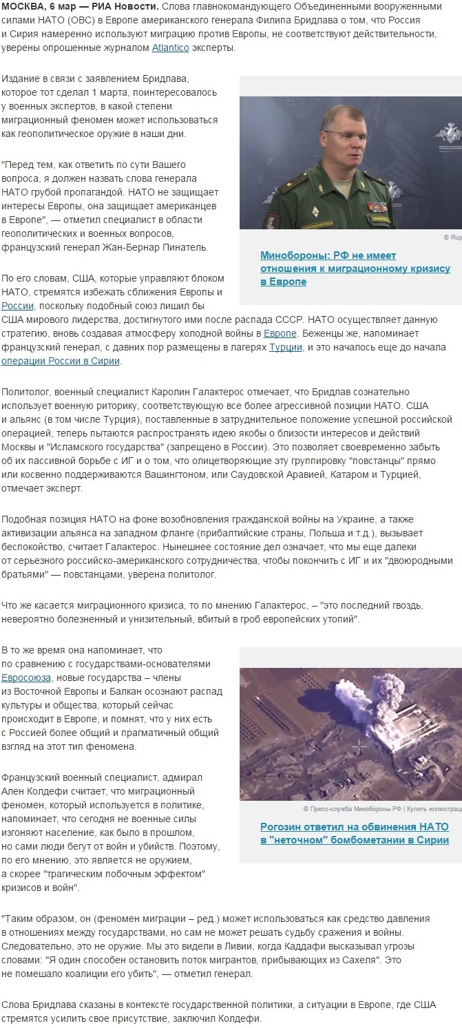 «Atlantico» провел опрос французских военных экспертов относительно заявления главнокомандующего силами НАТО в Европе американского генерала Бридлава, назвавшего Россию «долгосрочной экзистенциальной угрозой для США и их союзников» и заявившего, что НАТО наращивает силы в Восточной Европе, готовясь к возможной войне с Россией.