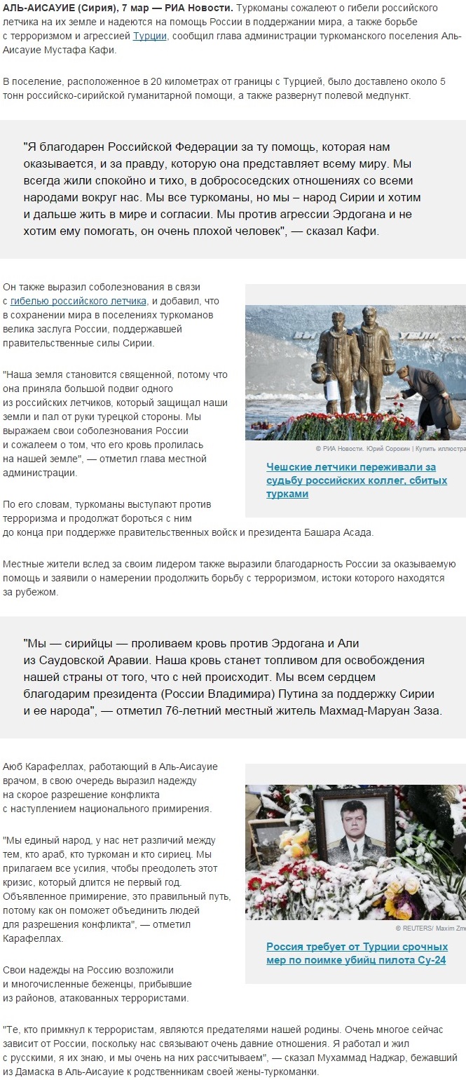 Сирийские туркоманы присягают Асаду (то есть Сирии) и выражают глубочайшее уважение России, защищающей их от террористов и турецкой агрессии. Турция не раз прямо заявляла, что населенная туркоманами северная часть Сирии – это турецкая зона влияния. Туркоманы же рассматриваются как естественная опора Турции в регионе (помимо Сирии, туркоманы проживают еще и в Ираке).