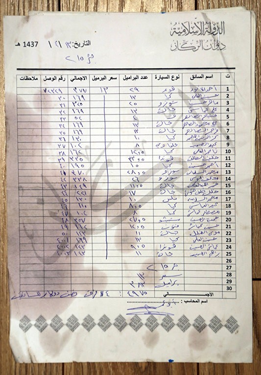 Если верить этим ведомостям, водители покупали нефть у ИГ по цене от 12 до 26 долларов за баррель. Отгрузка шла с месторождений Кабиба, Режура, Макхуль и Аль-Хейр. Например, только 23 января с нефтяного поля Кабиба отпущено 383 барреля по цене 13 долларов за баррель – итого 4979 долларов.