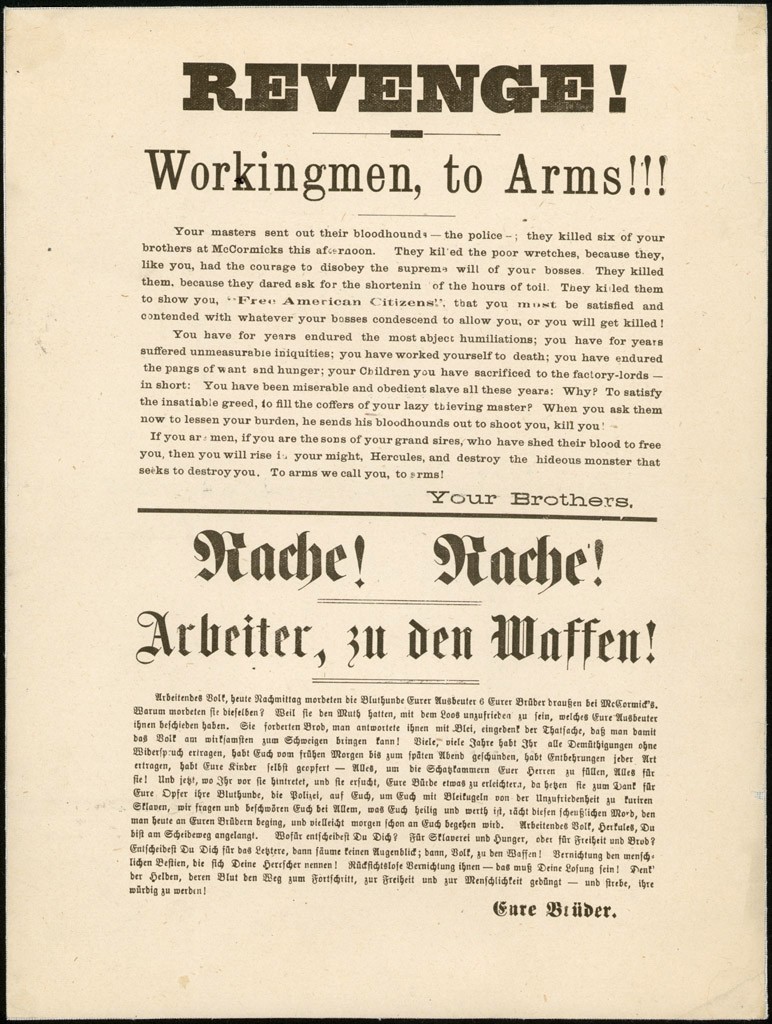 Сегодня после полудня они убили у завода Мак-Кормика шестерых ваших братьев, они убили бедняг за то, что те, подобно вам, имели смелость не повиноваться произволу ваших хозяев. Они убили их за то, что те осмелились потребовать сокращения часов тяжелого труда. Они убили их, чтобы показать вам, «свободные американские граждане», что вы должны быть довольны тем, что соблаговолят дать вам хозяева, иначе вас убьют.