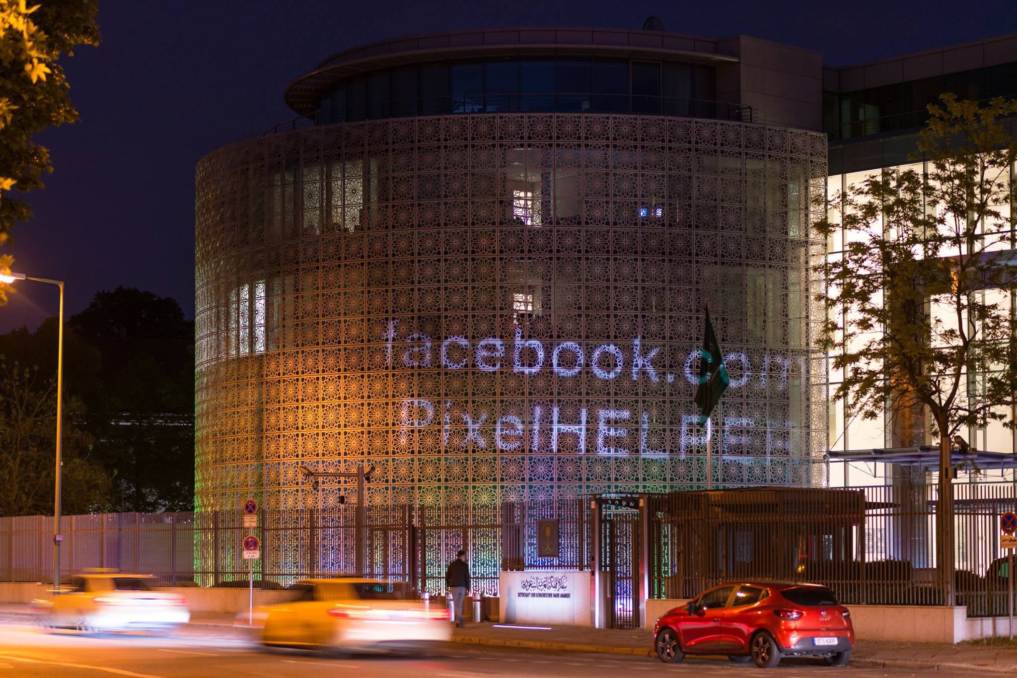 Участники группы PixelHelper при помощи специальной аппаратуры, в частности, лазерных проекторов, подсветили здание посольства Саудовской Аравии в Берлине провокационной надписью «Банк Исламского государства».