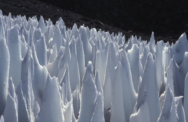 Эти пугающие снежные массивы образуются в высокогорных районах с высокой влажностью - например, в Андах. При высокой температуре ледяные "шипы" испаряются напрямую, даже не успевая стать жидкостью.