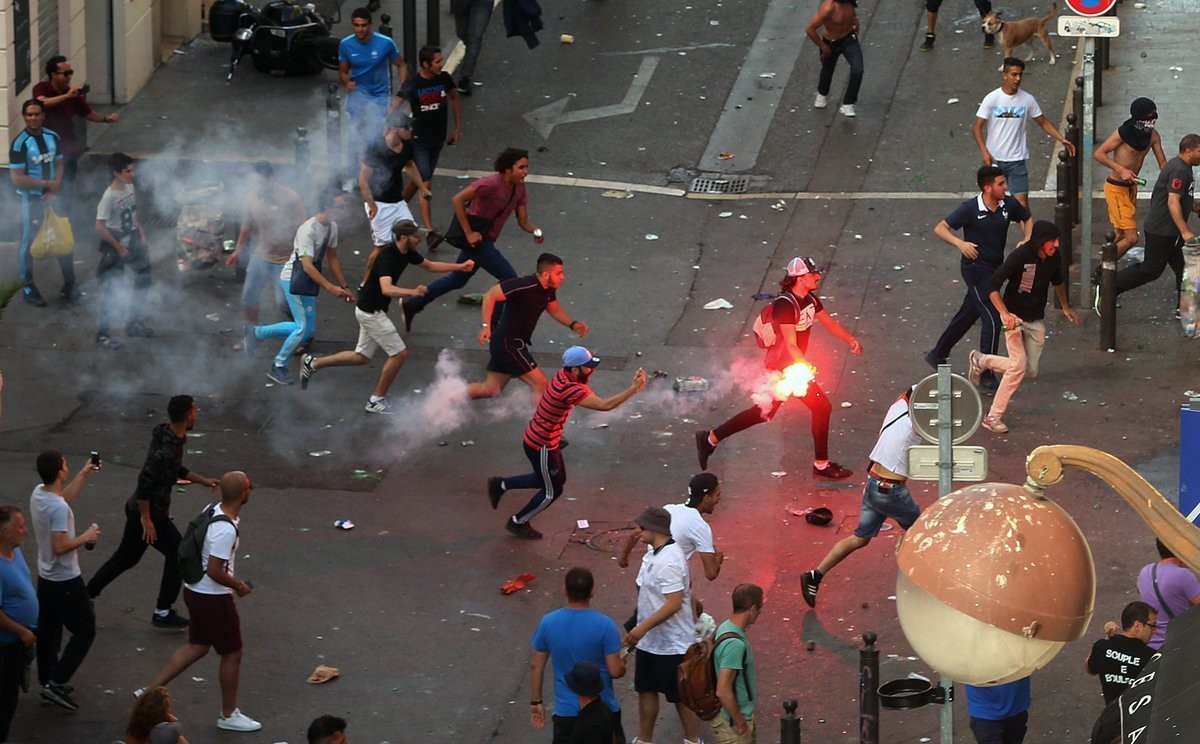 Беспорядки с насилием вспыхивали на протяжении всего викенда в Марселе, особенно во время матча Англия-Россия между русскими и английскими болельщиками, но и французы принимали участие. Десять человек предстали перед судом в понедельник в Марселе и были приговорены к наказаниям вплоть до одного года лишения свободы. Но ни один русский хулиган не был задержан, в то время как они, кажется, развязали столкновения с англичанами - в результате 35 раненых, и почти все англичане. Самый серьёзно раненый в понедельник был в критическом, но стабильном состоянии, заявил прокурор Марселя Брис Робан.