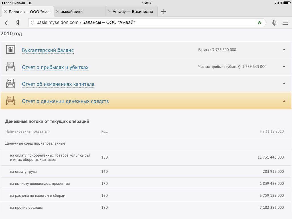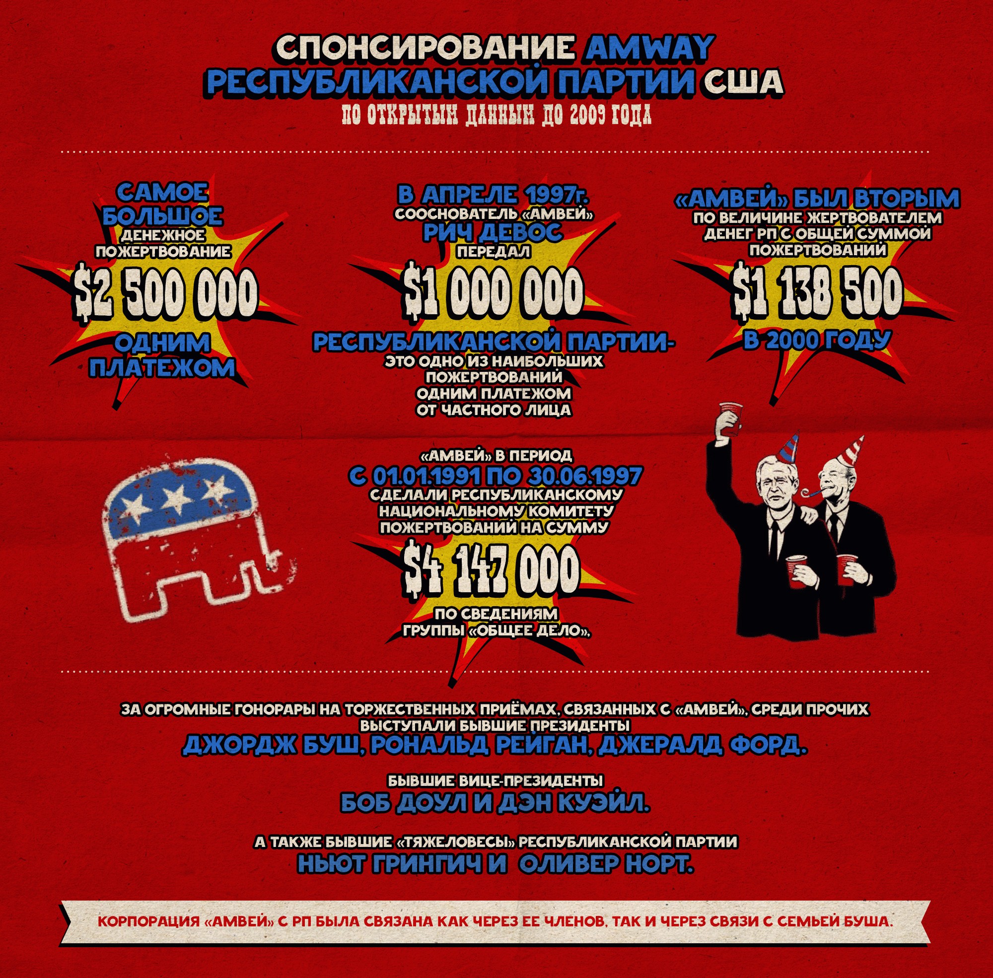 В 2004 и 2008 годах (выборные годы) учредители влили в «успешную» компанию «Амвей» равномерно более 170 миллионов рублей. В 2010-ом на выплату дивидендов и процентов потратили 1839 млн рублей, а злосчастным независимым предпринимателям заплатили 1,1 млн или по 1600 рублей «на нос».