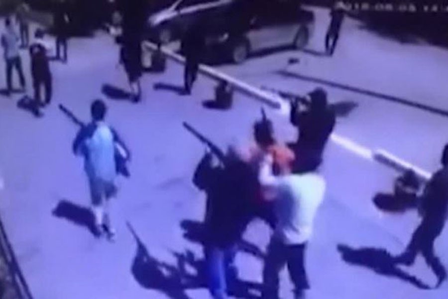 На видео с прилегающей улицы не просматриваются ни внешнее оцепление, ни пожарные машины, ни кареты «скорой помощи».