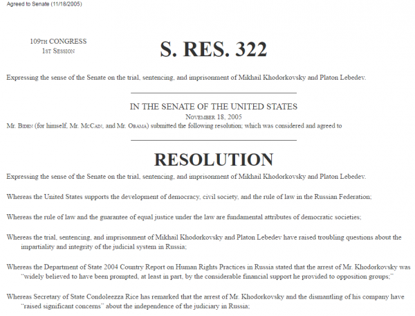 86 тысяч подписей уже собрала петиция на сайте Белого дома, которая просит прокурора проверить факты появления резолюции S.Res.322. Авторы петиции ссылаются на результаты журналистского расследования, в котором опубликована коррупционная схема, на вершине которой оказался Михаил Ходорковский.