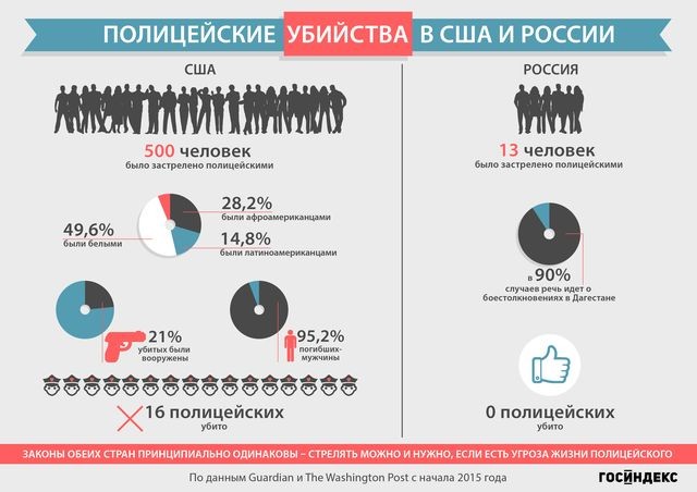 Итак, за год с небольшим доблестные американские копы застрелили порядка пятисот человек, из которых только пятая часть была вооружена и могла нести реальную угрозу жизни полицейских. Зачем было убивать остальные 80 процентов – неразрешимая загадка, ответ на которую мы будем искать ниже. Хочу также обратить внимание читателя, что за полтора года по всей необъятной России, где, что греха таить, всякое бывает в криминальном плане, не был убит ни один полицейский. А в США их завалили аж 16 штук – точнее, 21, считая с пятерыми, застреленными Микой Джонсоном в Далласе позавчера. Что как бы намекает нам на странную закономерность: там, где полиция не убивает население, и самих копов гибнет куда меньше, вплоть до нуля.