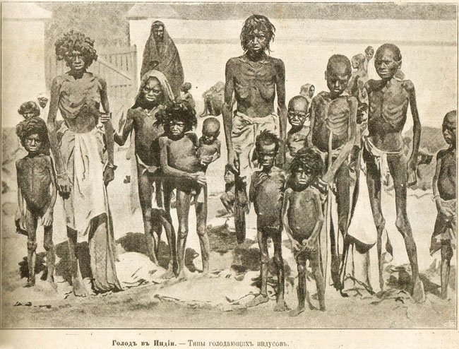Жертвами "большого голода" 1876-1878 гг., поразившего в первую очередь, Бомбей и Мадрас, стали по данным английской администрации около 2,5 млн., а по индийским данным около 10 млн. человек [5].