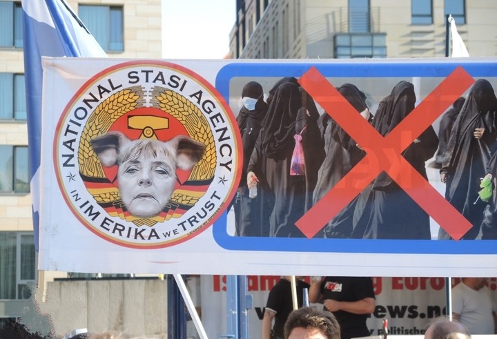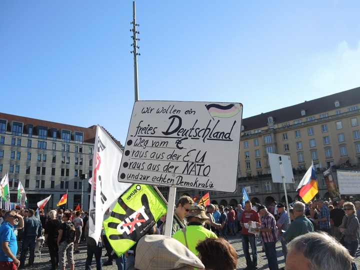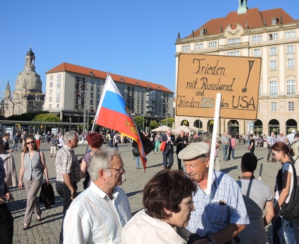 Понедельник. Центр Дрездена, окруженный множеством полицейских машин. Музыканты в народных костюмах играют народные песни, им подпевают немолодые женщины и мужчины, весело притоптывая ногами. Немало и молодых мужчин с вызывающим выражением лица. То, что я вижу, повергает меня в столбняк. Повсюду гордо развеваются русские флаги. Один флаг просто удивителен: наполовину немецкий, наполовину русский. Знаменосец пытается мне объяснить на плохом русском, что его флаг символизирует единство русских и немцев. Множество парней в футболках с портретом Путина. Плакаты с Путиным и рядом Меркель с ушами свиньи. Или Меркель в нацистской форме со знаком евро, напоминающем свастику. Плакаты с мусульманскими женщинами в бурках, перечеркнутые крест-накрест. Призывы к «дружбе с Россией» и «войне с НАТО». Люди, где я? Это Германия?