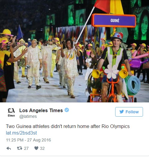 «Пловец Амаду Камара и дзюдоист Маме Адама Бангура сбежали из олимпийской деревни и остались в Бразилии. С нами на родину они не вернулись», – сказал член Олимпийского комитета Гвинеи Атеф Чалобу агентству Reuters.